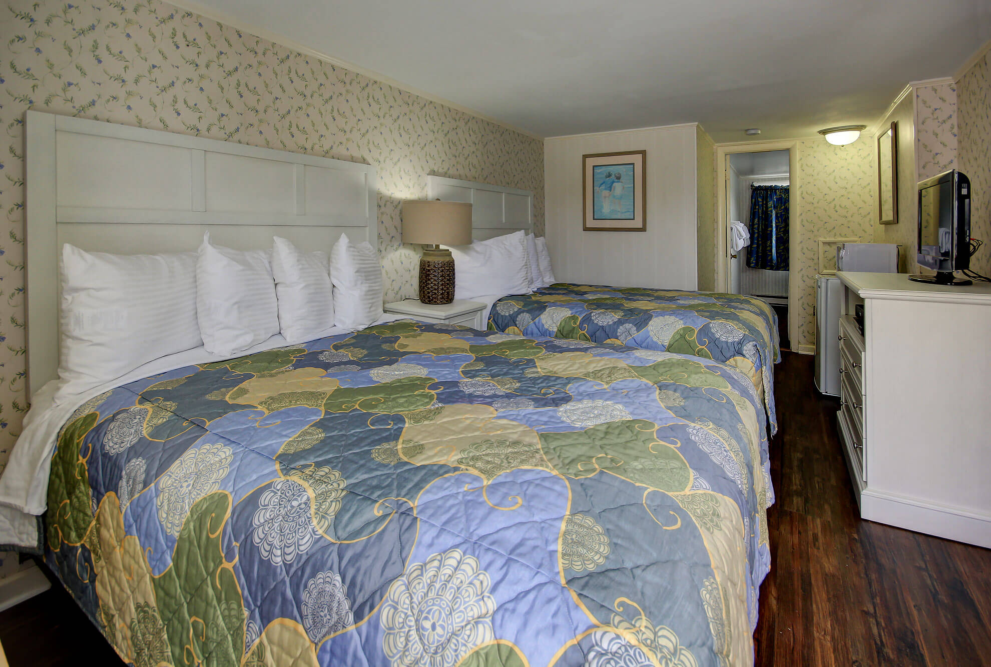 This unit is a first floor studio room with two queen beds, and bath with shower (no tub). LCD flat screen television and DVD player, telephone, small refrigerator and individually controlled A/C. Daily housekeeping service.