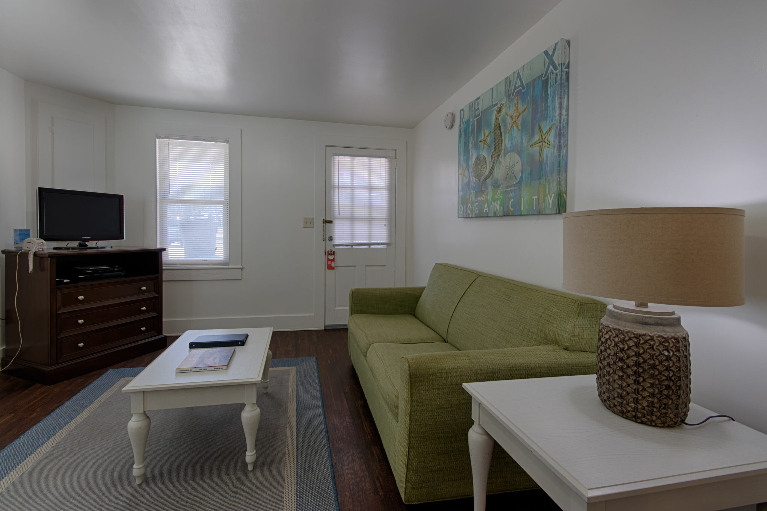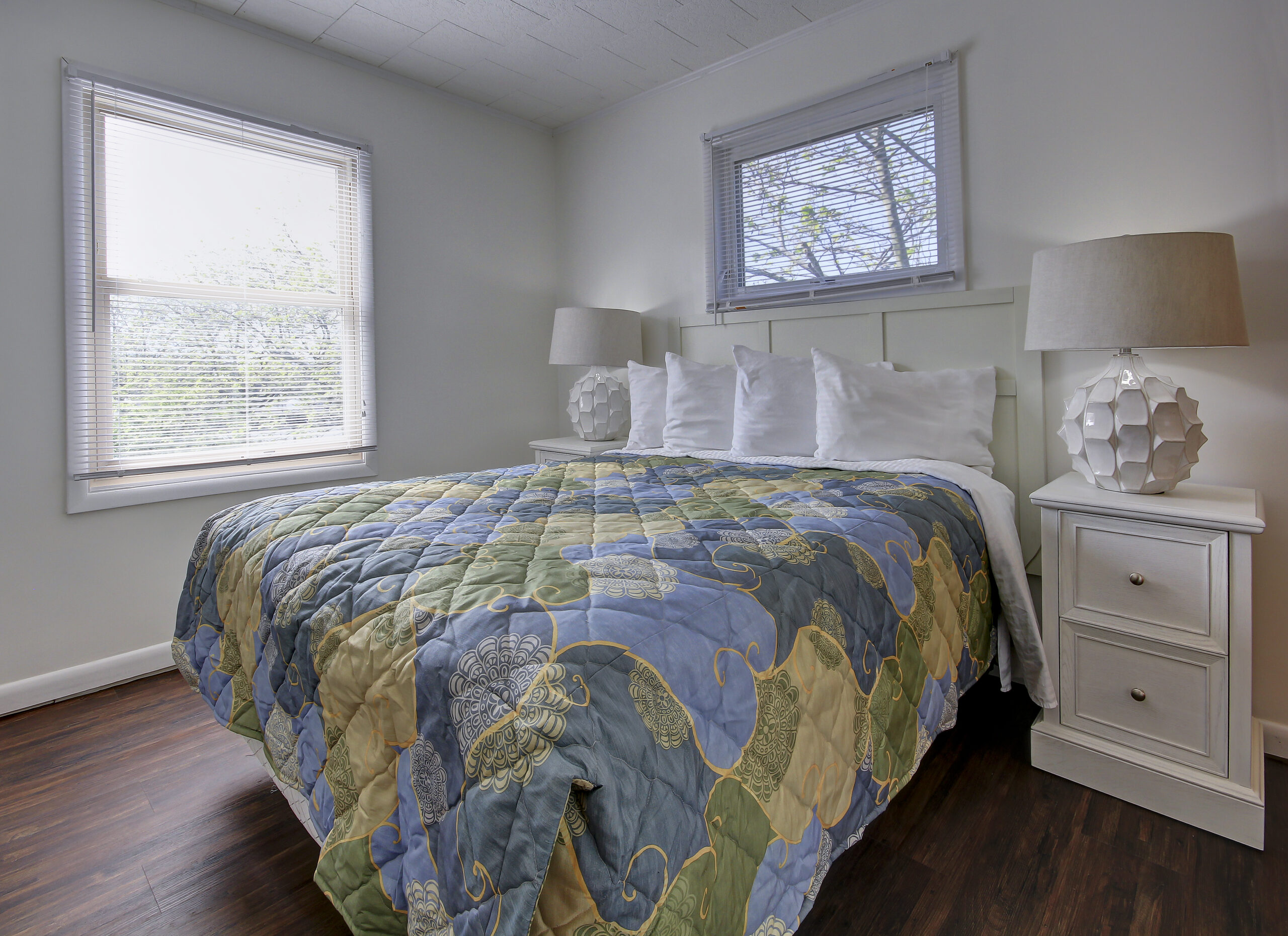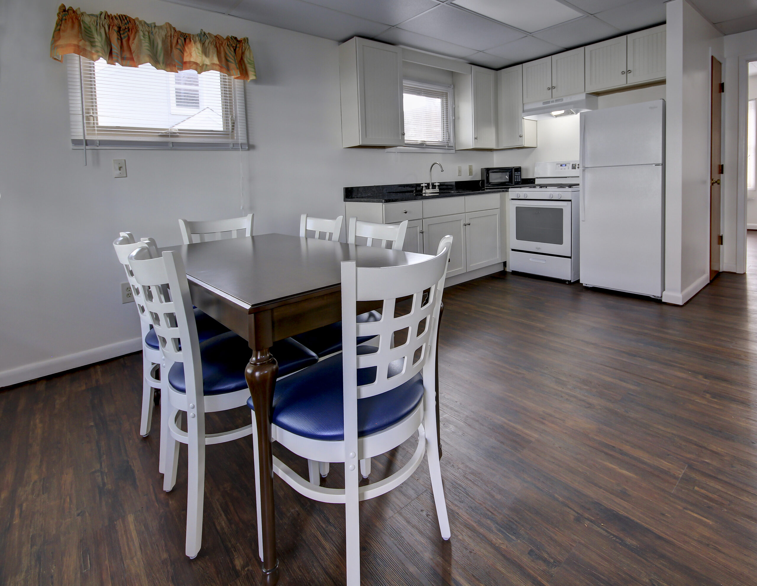 These two bedroom apartments accommodate up to six people. One bedroom with a queen bed, one bedroom with two twin beds, living room with sofa bed, kitchen, full bath and porch. LCD flat screen television, DVD player, telephone and A/C. Weekly housekeeping service only.